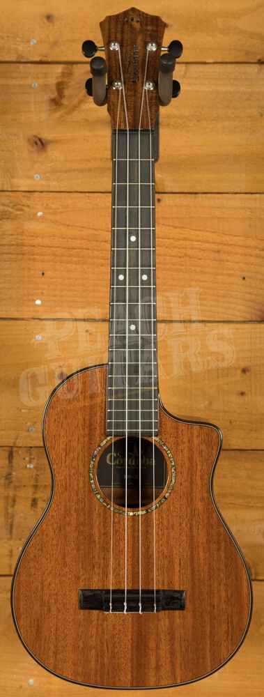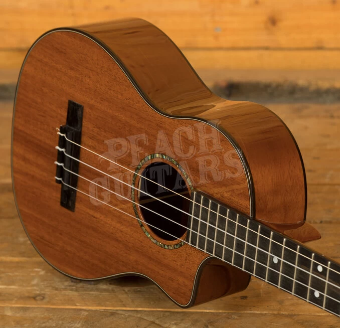 The 30T-CE tenor uke is an extremely lightweight instrument that features the classic combination of a solid mahogany top, back and sides, giving it a warm and balanced sound. It features a soft cutaway and the L.R. Baggs FIVE.O pickup, a small, lightweight pickup specifically engineered for the ukulele’s unique size and voice This whole system weigh less than a standard 9V battery! It also has a beautiful rosewood bridge, binding, and fingerboard.