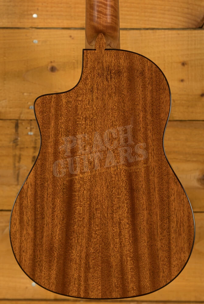 The styling is refined and sleek, using abalone for the inlaid rosette and rosewood for the binding, capped off with Cordoba’s signature elevated headstock with a figured acacia overlay. The finish is a gloss polyurethane, applied as thin as possible for maximum resonance. Other features include a black TUSQ nut and saddle, chrome Grover tuners, and a Cordoba polyfoam case.