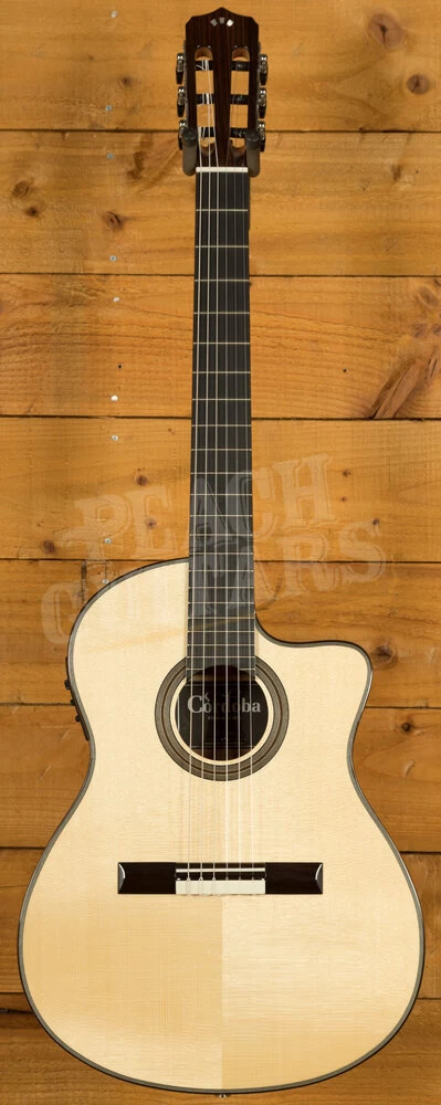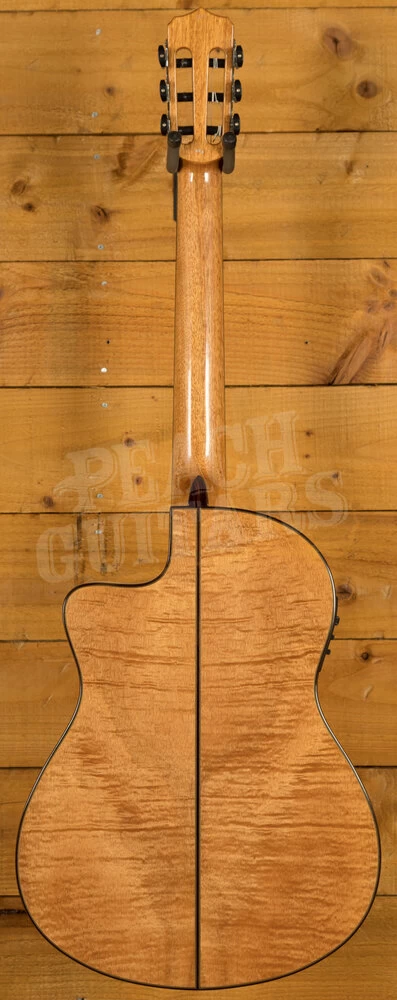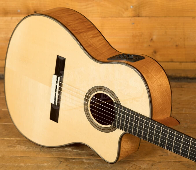 The 14 Maple is a solid top, cutaway electro guitar from Cordoba’s Fusion line. The purpose of this series is to offer a nylon-strung guitar to a player that prefers a thinner neck profile than a traditional classical guitar and also sports a 16″ radiused fingerboard.