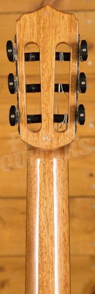 The top of the guitar is made from solid spruce and features flamed maple back and sides. The flamed maple not only looks beautiful but it also gives a very snappy and responsive touch to guitar; ideal for getting notes and chords to jump out. As mentioned, the guitar features a slim neck and the nut width is 48mm as opposed to a more traditional 50.8mm. The neck joins the body at the 14th fret. This will further aid the guitar in feeling familiar to acoustic steel-string players. The bridge is also shifted forward to increase the ease of playabilty; combined with the exposed higher frets, this guitar is great for playing melodies and lead lines on.