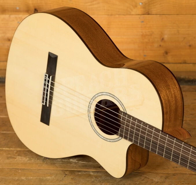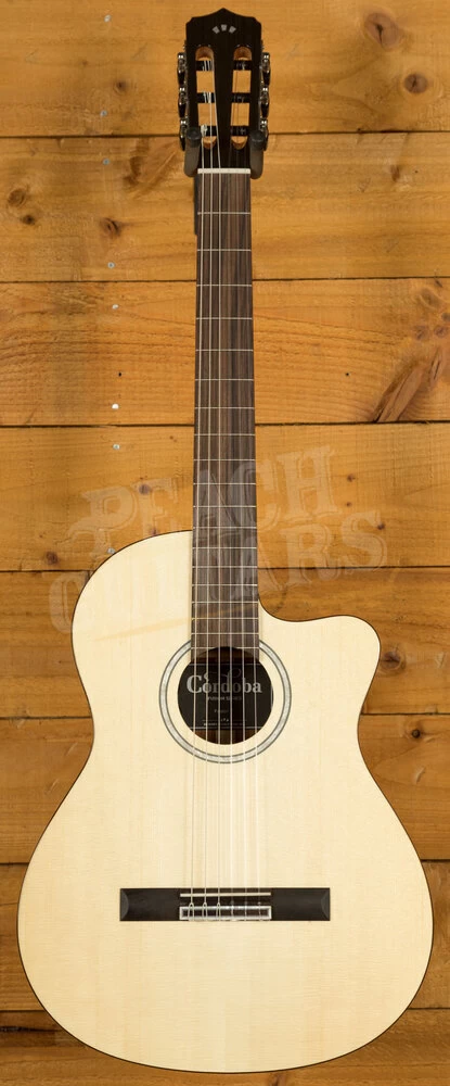 The Fusion 5 is a solid top, cutaway electro guitar from Cordoba’s Fusion line. The purpose of this series is to offer a nylon-strung guitar to a player that prefers a thinner neck profile than a traditional classical guitar and also sports a radiused fingerboard.