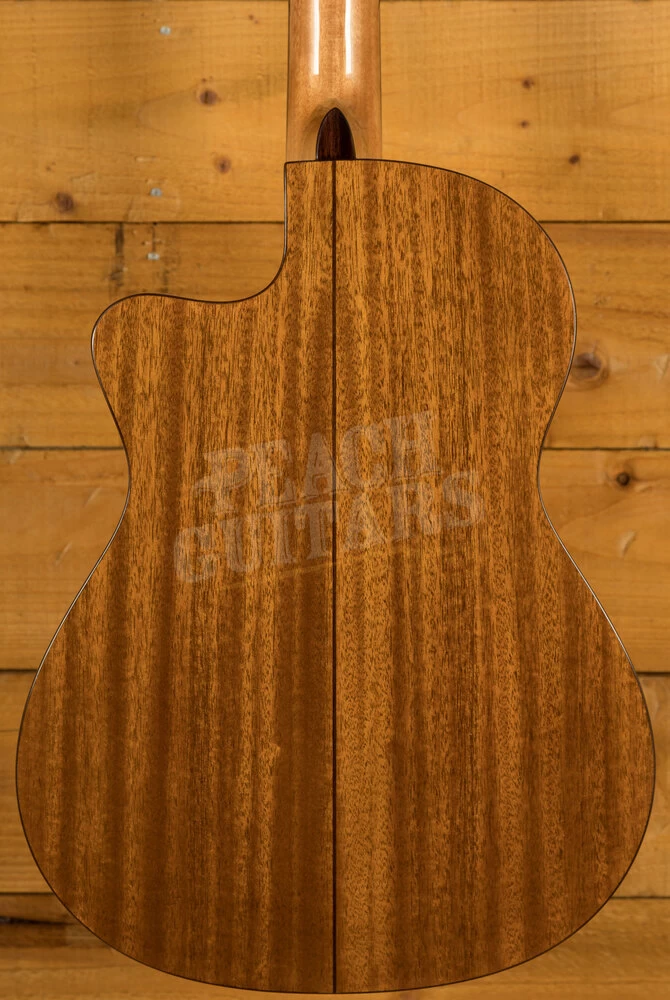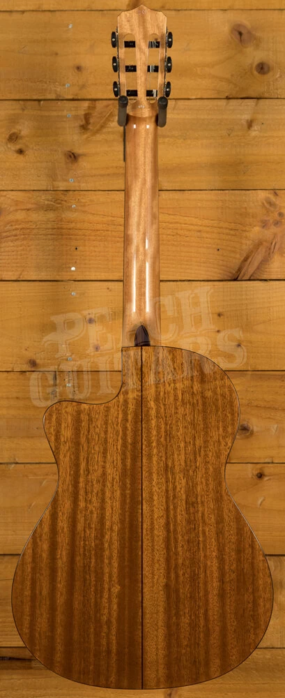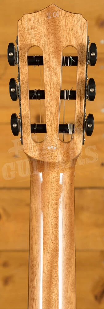 The top of the guitar is made from solid spruce and features mahogany back and sides. This is a classic choice for nylon-strung guitars and with good reason – it sounds great! As mentioned, the guitar features a slim neck and the nut width is 48mm as opposed to a more traditional 50.8mm. The neck joins the body at the 12th fret. This gives a beautiful and mellow sound yet access to the higher frets is still easy due to the cutaway.