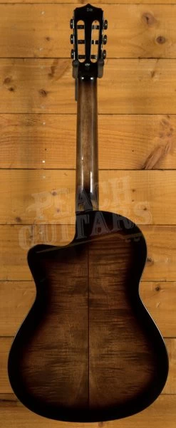 The top of the guitar is made from solid spruce and features flamed mahogany back and sides. This is a classic choice for nylon-strung guitars and with good reason – it sounds great! As mentioned, the guitar features a slim neck and the nut width is 48mm as opposed to a more traditional 50.8mm. The neck joins the body at the 12th fret. This gives a beautiful and mellow sound yet access to the higher frets is still easy due to the cutaway.