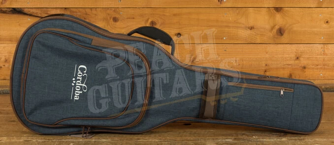 The Cordoba Stage Guitar includes an eye-catching and comfortable navy and brown, economically-made gigbag. Built from a durable shell of recycled post-consumer nylon, such as discarded fishing nets and mircoplastics. It will carry your tuner, cables, preamp, sheet music; everything you need to show up stage-ready.