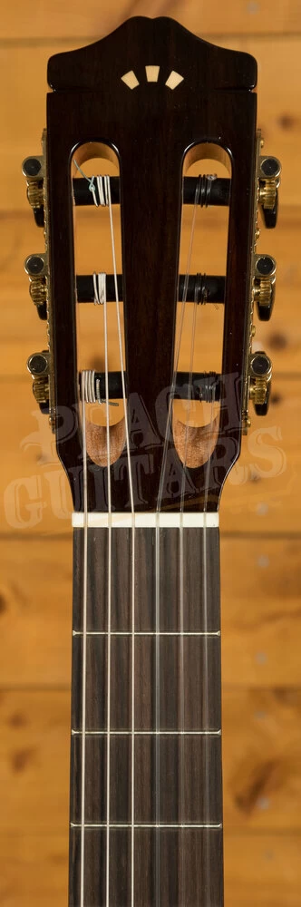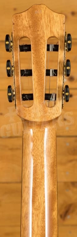 In this instance, the GK Studio Limited goes with the standard spruce top (in this case solid) but with exotic ziritcote back and sides. This gives both a beautiful appearance but also a fantastic tone. This will give a bassier tone than the blanca models. The body is a little thinner than a classical guitar (as is the nut width and neck itself) and a clear tap plate is installed on the top (to protect it from the flamenco style). The neck is fitted with a two-way truss rod so that the action can be adjusted over time if needed or desired.
