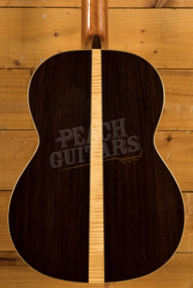 The guitar is fitted with a two-way truss rod so that the neck can be adjusted over time, if needed or desired. It ships with a high-quality set of Savarez strings and a polyfoam case that offers excellent protection whilst still being very light. Extra touches of beauty are added in the form of a pearloid 1920s style rosette, a high-gloss finish, matched maple binding and a stunning wedge of flamed maple on the back of the instrument.