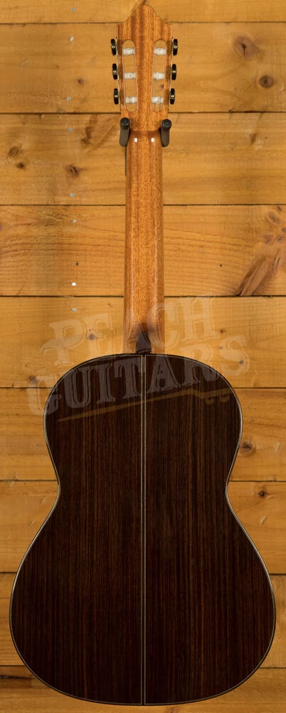 The rosette is particularly detailed and beautiful, handmade from wood. A final touch of beauty comes from a thinly applied coat of finish used to protect the guitar without stopping the free vibration of the wood. An excellent quality arched, wooden and humidified case is supplied with the guitar to keep it safe so that it may be enjoyed for many decades.