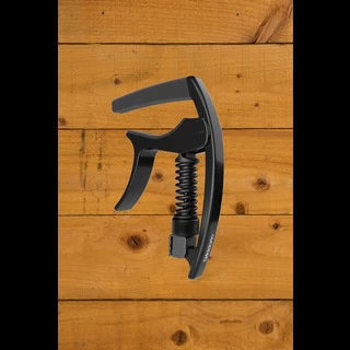The Tri-Action capo in black assures buzz-free, in tune performance at any fret. The patent-pending Tri-Action geometry reduces the force required to open and close the capo and applies even tension regardless of neck profile. Combined with the micrometer tension adjustment and direct horizontal pressure, the Tri-Action Capo virtually eliminates pulling the strings side to side and the need to retune during use. Additionally, the lightweight aluminium construction adds negligible weight to the neck of the instrument. The capo features an integrated pick holder and is a Ned Steinberger design.