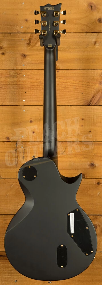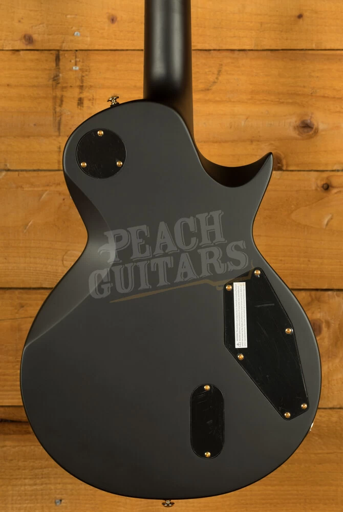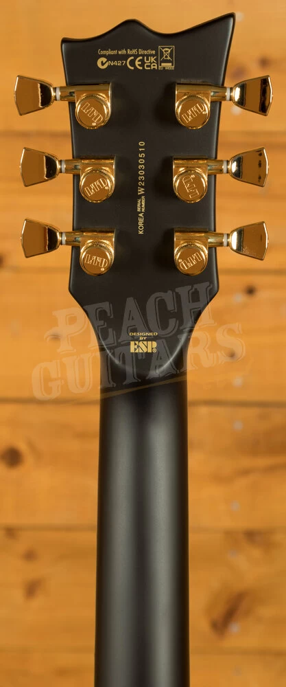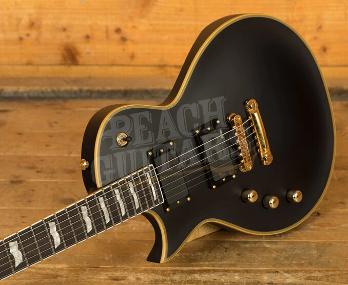 It offers a vintage looking body/neck/headstock binding and gold hardware, and includes premier components like LTD locking tuners, a Tonepros locking TOM bridge and tailpiece, and the aggressive punch of active EMG 81/60 pickups. It also offers set-thru construction with a mahogany body, 3 pc. mahogany neck, and 24-fret Macassar ebony fingerboard. This particular example looks awesome in the Vintage Black finish – a great compliment to the binding and gold hardware.