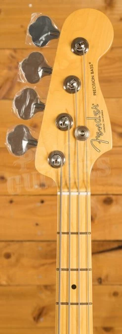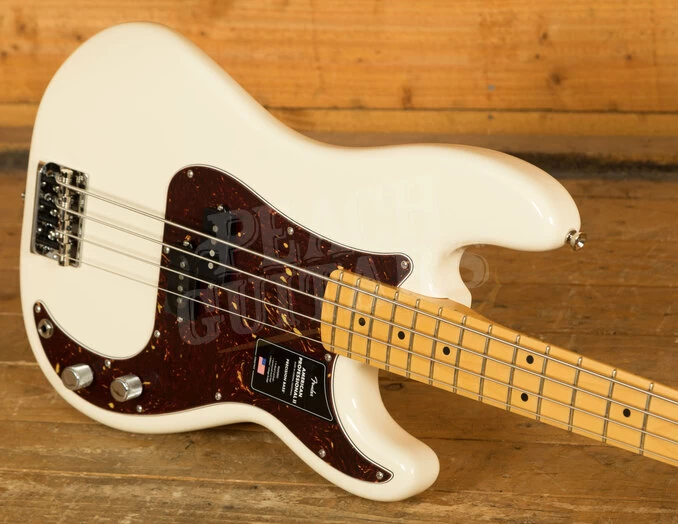 The Alder body is typically comfortable, as all Precision Bass’s are, finished in the brilliant Olympic White option, it looks real slick. The Maple neck and fingerboard feature a ’63 profile, designed for speed and comfort; This bass is super easy to navigate, allowing for great access to the upper register. 20 frets, a 9.5″ radius and 34″ scale length make this Precision Bass feel familiar and supremely comfortable. The Professional II range brings a new contoured neck heel , soft rolled fingerboard edges and a super natural finish for improved feel and comfort
