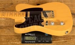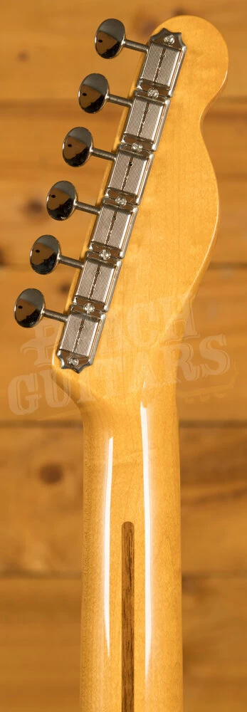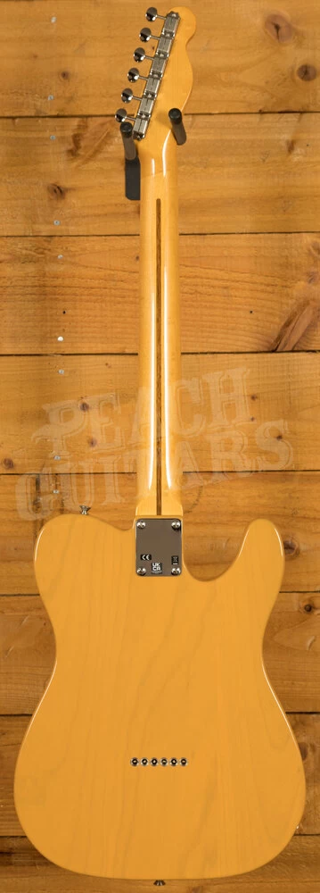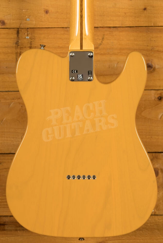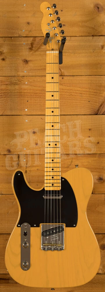 The American Vintage II 1951 Telecaster features an ash body finished in Butterscotch Blonde to capture the tone and look of the original. The substantial ’51 ‘U’-shaped hard rock maple neck plays like a dream with a 7.25″ radius fingerboard and vintage tall frets. Characteristic of production in 1951, the 12th fret face-dot spacing is narrow and the sole Phillips-head fastener on the guitar is at the truss rod nut. The triple brass saddle bridge, single-line ‘Fender Deluxe’ tuners and Pure Vintage ’51 Telecaster pickups deliver classic twang and authentic Fender style.