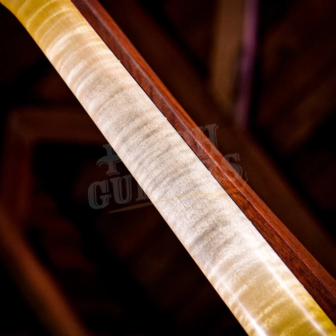 The 3A Flame Maple neck is real comfortable. With a 60 Style oval C profile, 9.5″ radius and 6100 frets it’s super resonant and feels incredible underhand. The Rosewood fingerboard is a treat to play, perfectly balanced and with flawless playability right up the neck, it’s a real player’s piece.