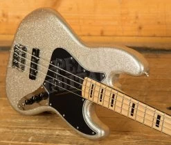 Prepare to be captivated by the eye-catching design of the Mikey Way Jazz Bass. Its alder body boasts a dazzling silver sparkle finish, while the sleek maple neck features black binding, block inlays, and a gloss black painted headstock. This bass is not just a visual stunner, but also a powerhouse of sound. Equipped with vintage-style ’70s single-coil Jazz Bass pickups, it delivers that iconic sound that defined an era of rock music. From punchy lows to articulate highs, this instrument offers unmatched versatility.