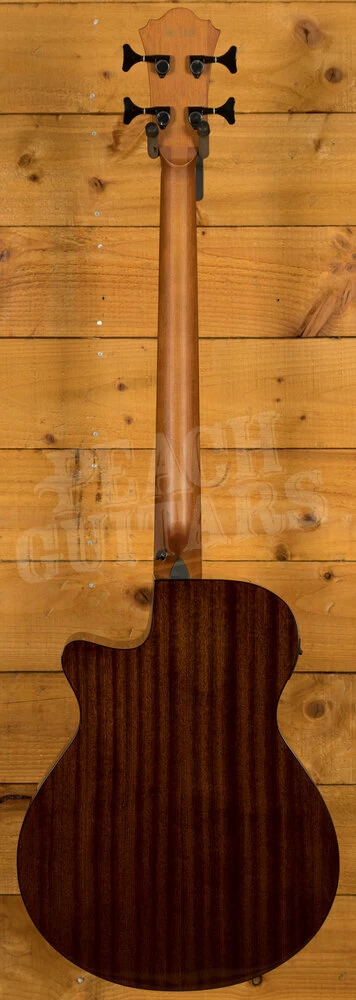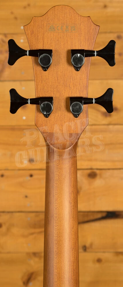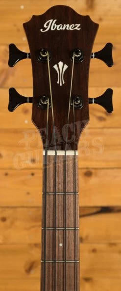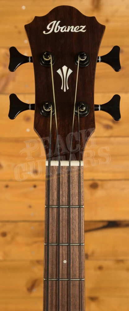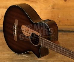 The AEGB24E features a thin body with a soft Florentine cutaway. The top is laminated sapele with herringbone purfling and black binding on sapele back and sides. The round soundhole has an acrylic rosette and and a wooden thumb rest. It has a nyatoh and maple neck with a 32″ scale and a 21-fret walnut fingerboard with white dot position markers. Components include a compensated plastic saddle in a walnut bridge with black plastic bridge pins, a plastic nut, and black Ibanez die-cast tuning machines.