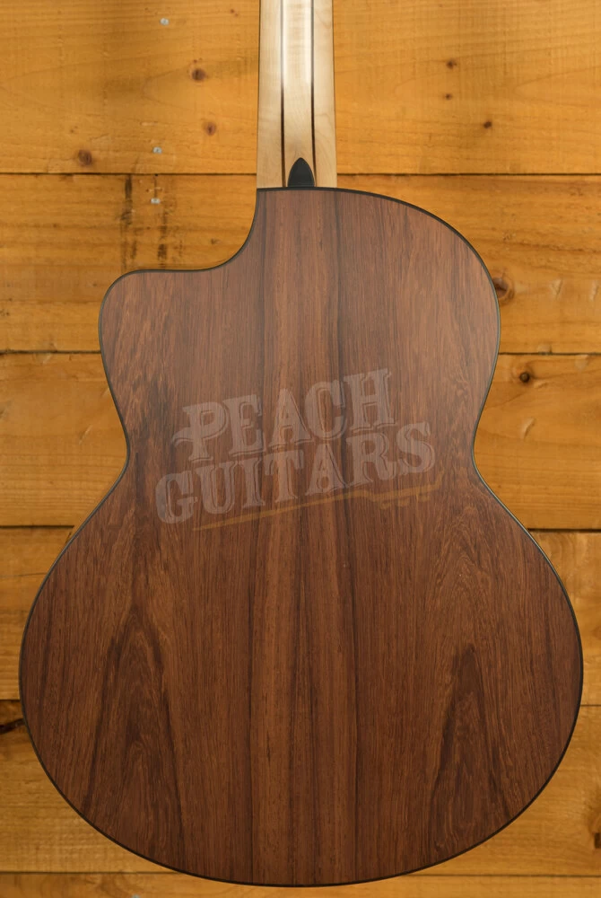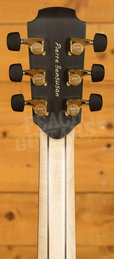 Every aspect of the Pierre Bensusan model exudes excellence and attention to detail. From the Mottled Ebony bindings and rocklite-maple-mahogany purflings to the Gotoh Gold 510 tuners with Ebony buttons, no compromise is made in ensuring the utmost quality and aesthetic appeal. The guitar’s design includes a cutaway for enhanced upper fret access and the aforementioned coveted soundbox bevel, a curved piece of wood that rests on the upper bout and provides unparalleled comfort for your arm.