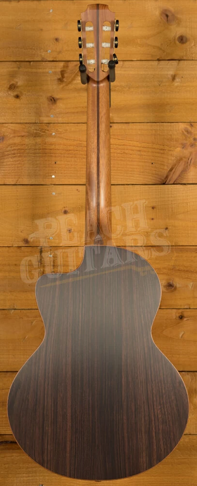 The S-25 Jazz features a neck specifically designed to accommodate nylon strings without sacrificing playability. Crafted from a five-piece combination of Mahogany, Walnut, and Purpleheart, this neck offers optimal stability and ensures a comfortable playing experience. The cambered and extended fingerboard, constructed from Ebony, allows for effortless navigation across the frets, enabling a wide range of playing styles and techniques.