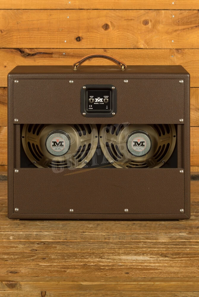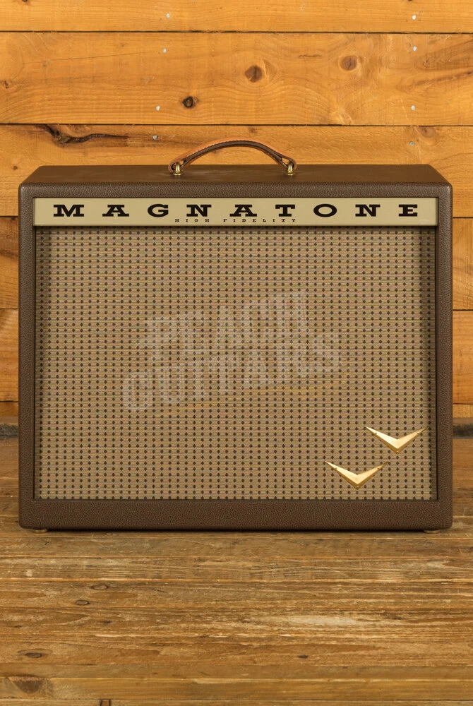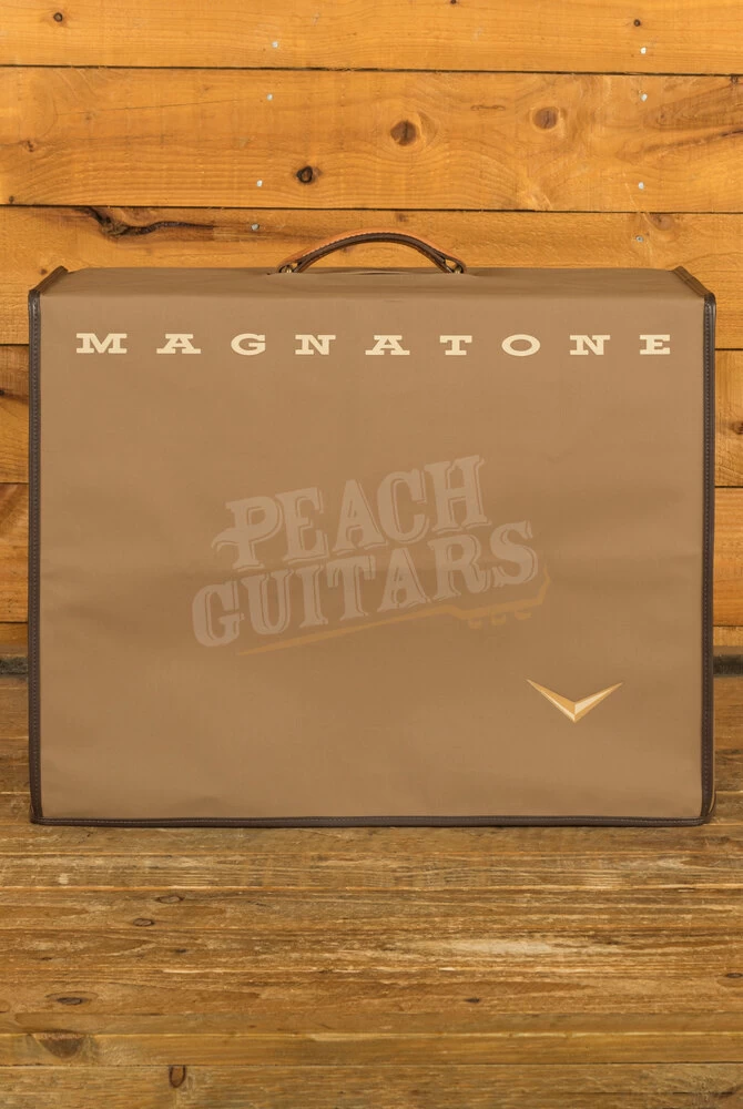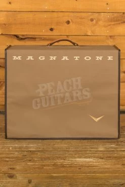 The Magnatone Traditional Series 2×10 Cab is a testament to craftsmanship and quality. This cabinet is built with precision, featuring a finger-jointed construction and a 100% cotton textile covering. It’s not just about durability; it’s about aesthetics too, with 14K gold plated decorative chevrons that add a touch of elegance to your setup. The custom Magnatone embossed saddle leather handle is not only functional but adds a classic, timeless look to the cabinet.