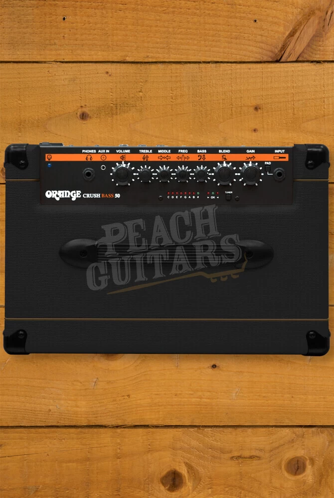 The Crush Bass 50 features an EQ circuit inspired by Orange’s prestigious 4 Stroke Series amplifiers. At its centre is a parametric mid band. This presents players with a much greater degree of control over the sound than a traditional EQ, allowing them to vary the frequencies they want hear. The mid band covers a wide range, sweeping from 300Hz (fully counter-clockwise) to 2.7kHz (fully clockwise), meaning this amp can be fine tuned to suit any musical style. The active circuitry allows for up to 15dB of boost or cut on the bass and middle frequencies, and up to 20dB on the treble side.
