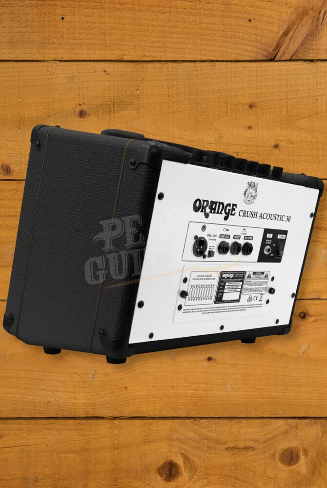 The Crush Acoustic 30 is the perfect amp to use on the go. The battery compartment takes 10 AA batteries, giving you 3 hours of power at full volume, 5 hours at 50% volume and 8 hours at low volume. The Crush Acoustic 30 can also be powered by the supplied DC adaptor, which disconnects the batteries when in use.