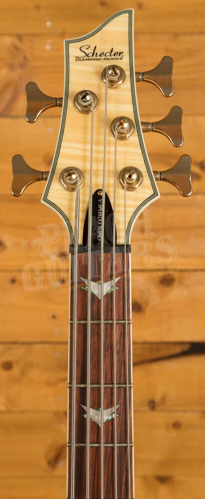 The Maple neck provides some tightness and cut to the bass’s tone, delivering an edge of sizzle to the highs and firmness to its lows. The Maple wood provides bright characteristics to the overall tone, whilst offering a snappy attack in the midrange. Adding a Rosewood fingerboard helps to fur up to the Maple’s sound, whilst contributing to its smoothness. The Rosewood/Maple combination brings warmth to the guitars tone, adding sparkle to the highs, thickness to the lows, and opens up the mids. The Omen Extreme also comes with many other features, including Schecter tuners, a Graph tech nut, and abalone/pearloid vector inlays on the fretboard.