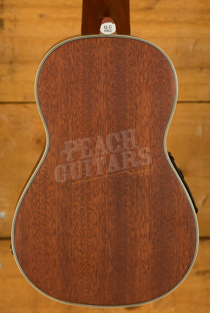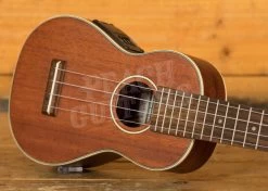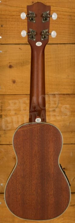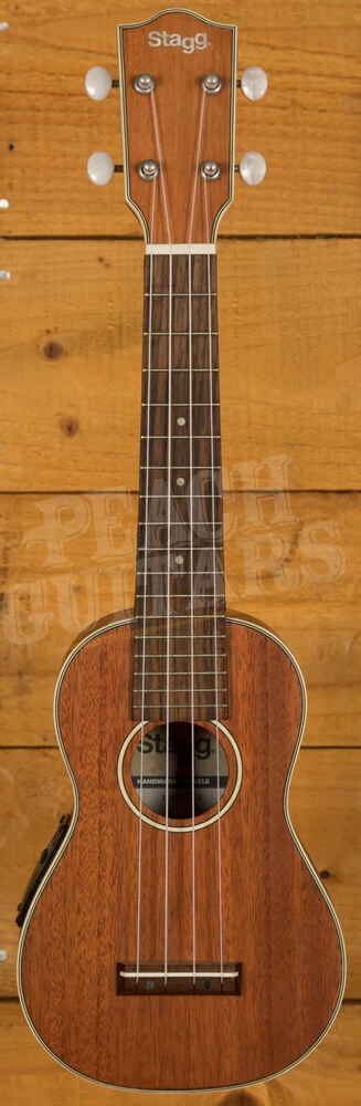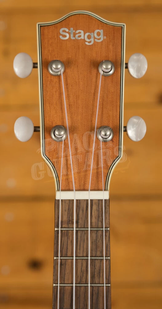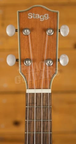 An excellent value for money all-solid mahogany ukulele from Stagg. It comes with a gig bag and can be plugged in for live performance or recording. The strings are by GHS and the appointments look lovely with soundhole inlay, binding on the headstock and body and antique white buttons on the geared tuning machine heads. The finish is in a natural matte.