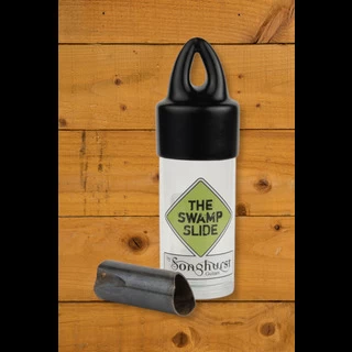 The Rock Slide Aged Brass slides are effectively one solid brass rod that has been carved by a CNC machine to fit your finger. The brass formula that they use is very heavy to give excellent tone and sustain. The walls of the slide are generously thick and get even more so towards the end of the slide, as it tapers on the inside. There is also a tone ring at the fingertip that gives additional mass and helps your finger stay securely in place. This slide really does cut through the mix; combined with its cutaway and design innovations it is also extremely comfortable. A fantastic slide.