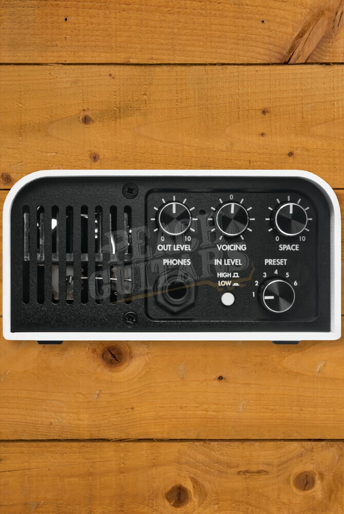 - VOICING – The Voicing knob controls the mid range of all presets simultaneously. Balance the sound of the room on the fly by cutting or boosting the mids.